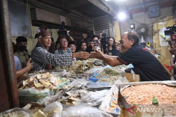 Calon presiden nomor urut 3 Ganjar Pranowo (kiri) berbincang dengan pedagang saat mengunjungi Pasar Kranggan di Bekasi, Jawa Barat, Sabtu (16/12/2023). Dalam kunjungannya Ganjar juga mendengarkan keluhan serta aspirasi dari pedagang, berbelanja sekaligus mengecek harga-harga bahan pokok. ANTARA FOTO/Akbar Nugroho Gumay/YU