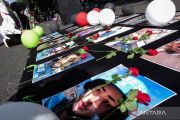 Warga menaruh bunga mawar di atas sejumlah foto jurnalis peliput konflik Israel-Hamas di Gaza, Palestina pada aksi damai di Solo, Jawa Tengah, Minggu (17/12/2023). Aksi tersebut sebagai wujud solidaritas warga terhadap para jurnalis yang bertugas maupun rekan mereka yang tewas akibat serangan Israel di Gaza, Palestina, sekaligus meminta para pemimpin dunia agar mendesak Israel menghentikan perang guna melindungi keselamatan warga sipil Palestina. ANTARAFOTO/Maulana Surya/nym.