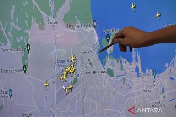 Petugas menunjukkan layar pemantuan angkutan penerbangan di Posko Terpadu Natal dan Tahun Baru di Bandara Internasional Soekarno Hatta, Tangerang, Banten, Senin (18/12/2023). PT Angkasa Pura II (Persero) mengaktifkan posko pemantauan tersebut mulai 18 Desember 2023 hingga 3 Januari 2024 untuk mengoptimalkan pelayanan dan pengamanan bandara bagi calon penumpang angkutan udara saat libur Natal 2023 dan Tahun baru 2024. ANTARA FOTO/Sulthony Hasanuddin/aww.