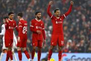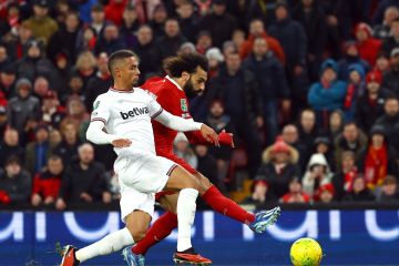 Pemain Liverpool Mohamed Salah mencetak gol keempat pada laga perempat final Piala Carabao melawan West Ham United di Anfield, Liverpool, Inggris (20/12/2023). Liverpool berhasil menggasak West Ham United dengan skor 5-1 sehingga mengantarkan The Reds melaju ke babak semifinal. ANTARA FOTO/REUTERS/Molly Darlington/aww.