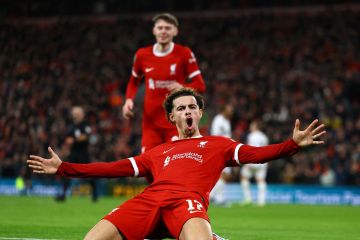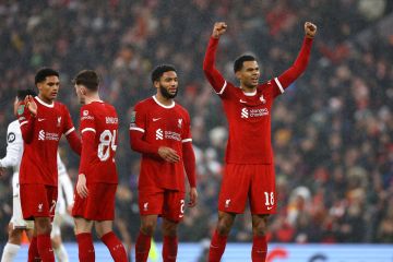 Ekspresi pemain Liverpool Cody Gakpo usai mencetak gol ketiga pada laga perempat final Piala Carabao melawan West Ham United di Anfield, Liverpool, Inggris (20/12/2023). Liverpool berhasil menggasak West Ham United dengan skor 5-1 sehingga mengantarkan The Reds melaju ke babak semifinal. ANTARA FOTO/REUTERS/Molly Darlington/aww.