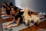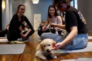 Pegiat yoga mengikuti kelas yoga bersama anak anjing (puppies) Golden Retriever di sebuah studio yoga di Paris, Prancis, Rabu (20/12/2023). ANTARA FOTO/REUTERS/Sarah Meyssonnier/foc.