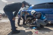 Sejumlah petugas membantu pengendara yang mengalami ban bocor di exit jalur fungsional Jalan Tol Solo-Yogyakarta, Klaten, Jawa Tengah, Sabtu (23/12/2023). PT Jasa Marga menyiagakan petugas Mobile Customer Service untuk membantu pengendara jika mengalami gangguan kendaraan atau keadaan darurat saat melintasi jalur fungsional Tol Solo-Yogyakarta. ANTARA FOTO/Aloysius Jarot Nugroho/rwa.