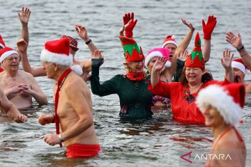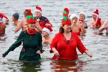 Anggota klub perenang es Berliner Seehunde (anjing laut Berlin) berenang di Danau Oranke dalam kegiatan renang tradisional merayakan Hari Natal di Berlin, Jerman, (Senin (25/12/023). ANTARA FOTO/REUTERS/Fabrizio Bensch/nym.