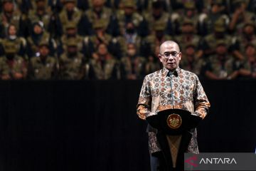 Ketua KPU Hasyim Asy'ari memberikan sambutan pada rapat konsolidasi nasional kesiapan Pemilu 2024 di Istora Senayan, Jakarta, Sabtu (30/12/2023). Jelang 45 hari penyelenggaran Pemilu 2024 KPU menggelar konsolidasi nasional yang diikuti anggota dan ketua KPU daerah se-Indonesia dalam rangka kesiapan penyelenggaraan Pemilu. ANTARA FOTO/Hafidz Mubarak A/aww.