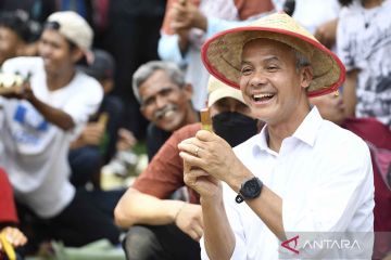 Calon presiden nomor urut 3 Ganjar Pranowo (kanan) memakan clorot (makanan tradisional) bersama saat bertemu dengan petani, tokoh agama dan tokoh masyarakat di area persawahan Cangkrep Kidul, Purworejo, Jawa Tengah, Minggu (31/12/2023). Dalam kesempatan tersebut Ganjar Pranowo berbagi tips bertani bagi anak muda dan menyerap aspirasi masyarakat sekitar. ANTARA FOTO/M Risyal Hidayat/YU