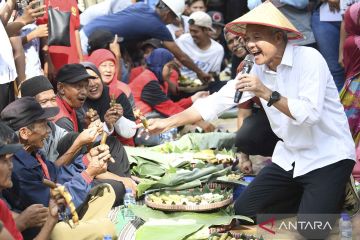 Calon presiden nomor urut 3 Ganjar Pranowo (kanan) makan makanan tradisional clorot bersama petani, tokoh agama dan tokoh masyarakat di area persawahan Cangkrep Kidul, Purworejo, Jawa Tengah, Minggu (31/12/2023). Dalam kesempatan tersebut Ganjar Pranowo berbagi tips bertani bagi anak muda dan menyerap aspirasi masyarakat sekitar. ANTARA FOTO/M Risyal Hidayat/YU