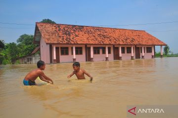 Dua anak bermain di depan sekolah yang terdampak banjir di Desa Ngambakrejo, Tanggungharjo, Grobogan, Jawa Tengah, Selasa (2/1/2024). Menurut data sementara BPBD setempat, banjir akibat hujan deras dan meluapnya Sungai Tuntang itu menyebabkan ratusan rumah dan fasilitas umum serta sejumlah jalan utama di tujuh desa di lima kecamatan terdampak banjir. ANTARA FOTO/Yusuf Nugroho/aww.