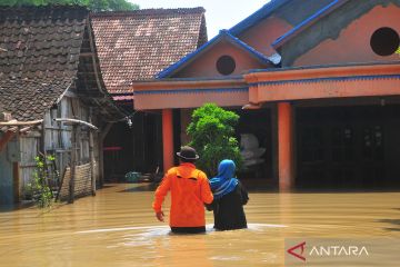Anggota Taruna Siaga Bencana (Tagana) membantu seorang warga yang terdampak banjir di Desa Ngambakrejo, Tanggungharjo, Grobogan, Jawa Tengah, Selasa (2/1/2024). Menurut data sementara BPBD setempat, banjir akibat hujan deras dan meluapnya Sungai Tuntang itu menyebabkan ratusan rumah dan fasilitas umum serta sejumlah jalan utama di tujuh desa di lima kecamatan terdampak banjir. ANTARA FOTO/Yusuf Nugroho/aww.