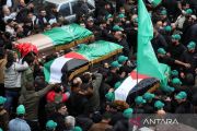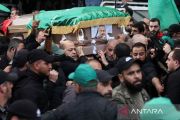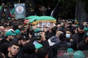 Para pelayat berkumpul saat pemakaman Wakil Ketua Hamas Saleh al-Arouri di Beirut, Lebanon (4/1/2024). Sumber keamanan Lebanon dan Palestina menyebutkan Saleh al-Arouri terbunuh akibat serangan pesawat tak berawak Israel. ANTARA FOTO/REUTERS/Mohamed Azakir/tom.