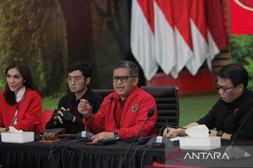 Sekjen PDI Perjuangan Hasto Kristiyanto (kedua kanan) bersama Wakil Ketua DPP PDIP Bidang Hubungan Luar Negeri Ahmad Basarah (kanan), kader PDIP Anggie (kiri) dan Aryo Seno Bagaskoro (kedua kiri) menyampaikan keterangan pers mengenai perayaan HUT ke-51 PDI Perjuangan di Kantor DPP PDIP, Jakarta, Sabtu (6/1/2024). HUT ke-51 PDIP yang akan berlangsung pada 10 Januari 2024 tersebut akan mengusung tema "Satyam Eva Jayate". ANTARA FOTO/Reno Esnir/Spt.