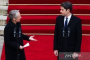 Perdana Menteri Prancis Elisabeth Borne (kiri) yang akan habis masa jabatannya berbincang dengan Perdana Menteri yang baru diangkat Gabriel Attal (kanan) pada upacara serah terima di Hotel Matignon di Paris, Prancis, Selasa (9/1/2024). Elisabeth Borne mengundurkan diri digantikan Menteri Pendidikan Gabriel Attal yang menjadi perdana menteri termuda dalam sejarah Prancis. ANTARA FOTO/Reuters/Emmanuel Dunand/Spt.