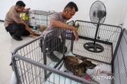 Petugas kepolisian mengecek kondisi anjing yang diselamatkan dari kasus penyelundupan di Semarang, Jawa Tengah, Rabu (10/1/2024). Relawan Animals Hope Shelter Indonesia merawat 226 ekor anjing barang bukti dari hasil pengungkapan tindak kejahatan penyelundupan anjing yang digagalkan oleh Polrestabes Semarang dan relawan pada Sabtu (6/1), kemudian akan dibuka kesempatan bagi masyarakat untuk adopsi anjing-anjing itu dengan persyaratan yang ketat usai penyelidikan pihak kepolisian selesai. ANTARA FOTO/Makna Zaezar/tom.