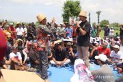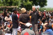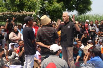 Calon presiden nomor urut 3 Ganjar Pranowo (tengah) berdialog dengan petani tebu di Kertosono, Nganjuk, Jawa Timur, Jumat (12/1/2024). Dalam kunjungan tersebut Ganjar menyerap aspirasi petani tebu rakyat diantaranya terkait harga jual tebu dan kualitas rendemen hasil panen. ANTARA FOTO/Prasetia Fauzani/aww.