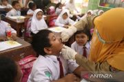 Petugas kesehatan memberikan imunisasi polio kepada siswa di SD Negeri Tempurejo 1, Kediri, Jawa Timur, Senin (15/1/2024). Layanan imunisasi dengan sistem jemput bola di sekolah tersebut sebagai upaya menyukseskan program pemerintah pemberian imunisasi polio serentak dalam menanggulangi kejadian luar biasa (KLB) polio. ANTARA FOTO/Prasetia Fauzani/tom.