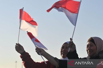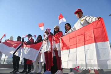 Sejumlah pendukung Timnas Indonesia mengibarkan bendera merah putih saat tiba di stadion untuk menyaksikan secara langsung pertandingan antara Indonesia melawan Irak dalam fase penyisihan grup D Piala Asia 2023, di Stadion Ahmad bin Ali Al Rayyan, Qatar, Senin (15/1/2024). ANTARA FOTO/Yusran Uccang/pras.