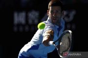 Petenis Serbia Novak Djokovic mengembalikan bola ke arah lawannya petenis Italia Jannik Sinner dalam pertandingan babak semifinal tenis Australia Terbuka di Melbourne Park, Melbourne, Australia, Jumat (26/1/2024). ANTARA FOTO/REUTERS/Issei Kato/nym.