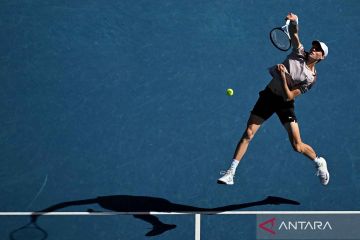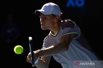 Petenis Italia Jannik Sinner mengembalikan bola ke arah lawannya petenis Serbia Novak Djokovic dalam pertandingan babak semifinal tenis Australia Terbuka di Melbourne Park, Melbourne, Australia, Jumat (26/1/2024). ANTARA FOTO/REUTERS/Issei Kato/nym.