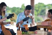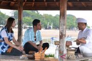 Cawapres nomor urut 2 Gibran Rakabuming Raka (tengah) didampingi istrinya Selvi Ananda (kiri) mencoba jamu buatannya saat mengikuti program wellness tourism atau pariwisata kesehatan dan kebugaran dalam rangkaian kegiatan bertajuk Gibran Suryaning Sanur di Pantai Mertasari, Sanur, Denpasar, Bali, Sabtu (27/1/2024). Pada kegiatan itu Gibran Rakabuming Raka mengamati perkembangan pariwisata dan perekonomian masyarakat pesisir. ANTARA FOTO/Fikri Yusuf/Spt.