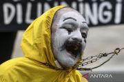 Seniman pantomim Wanggi Hoed bersama aktivis Koalisi Primates Fight Back menggelar aksi perlindungan terhadap satwa monyet saat Hari Bebas Kendaraan Bermotor (HBKB) di kawasan Bundaran HI, Jakarta, Minggu (28/1/2024). Menyambut Hari Primata Indonesia pada (30/1), Koalisi Primates Fight Back menuntut pemerintah menetapkan Monyet Ekor Panjang (Macaca fascicularis) dan Beruk (Macaca nemestrina) sebagai satwa yang dilindung untuk mencegah praktik perdagangan hewan-hewan tersebut. ANTARA FOTO/Hafidz Mubarak A/rwa.