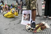 Aktivis Koalisi Primates Fight Back menggelar aksi perlindungan terhadap satwa monyet saat Hari Bebas Kendaraan Bermotor (HBKB) di kawasan Bundaran HI, Jakarta, Minggu (28/1/2024). Menyambut Hari Primata Indonesia pada (30/1), Koalisi Primates Fight Back menuntut pemerintah menetapkan Monyet Ekor Panjang (Macaca fascicularis) dan Beruk (Macaca nemestrina) sebagai satwa yang dilindung untuk mencegah praktik perdagangan hewan-hewan tersebut. ANTARA FOTO/Hafidz Mubarak A/rwa.