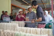 Wali Nanggroe Aceh Malik Mahmud Al Haytar (tengah) didampingi Pj Bupati Kabupaten Aceh Tengah T Mirzuan (kiri) mendengarkan penjelasan terkait pengolahan serat nanas saat peluncuran sentra usaha sosial dan pengetahuan serat nanas di Pegasing, Aceh Tengah, Aceh, Kamis (1/2/2024). Katahati Institute didukung Kedutaan Besar Kanada untuk Indonesia dan Timur Leste memberdayakan Kelompok Wanita Tani di Pegasing, Aceh Tengah untuk mengolah pelepah nanas menjadi berbagai produk eco fashion, mulai dari kain tenun, topi, gelang, bros dan lainnya dalam mengoptimalkan hasil hutan bukan kayu yang berkelanjutan secara ekonomi. ANTARA FOTO/Khalis Surry/aww.