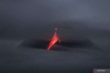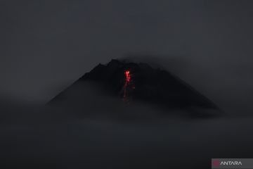 Luncuran lava pijar Gunung Merapi terlihat dari Srumbung, Magelang, Jawa Tengah, Jumat (2/2/2024). Data pemantauan BPPTKG menunjukkan suplai magma yang masih berlangsung dapat memicu terjadinya awan panas guguran di daerah potensi bahaya dan mengimbau masyarakat untuk mewaspadai lahar saat terjadi hujan di seputar Gunung Merapi. ANTARA FOTO/Hendra Nurdiyansyah/aww.