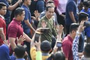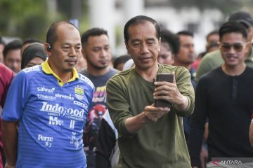 Presiden Joko Widodo menyapa warga saat berjalan kaki di Lapangan Gasibu, Bandung, Jawa Barat, Minggu (4/2/2024). Presiden Joko Widodo ditemani keluarga melakukan jalan santai di tempat itu. ANTARA FOTO/Hafidz Mubarak A/foc.