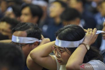 Mahasiswa memasang pita putih di kepalanya saat mengikuti pernyataan terbuka di Gedung Sekolah Tinggi Filsafat (STF) Driyarkarya, Jakarta, Senin (5/2/2024). Dalam pernyataan terbukanya tersebut, civitas academica meminta Presiden Joko Widodo menyetop upaya merusak demokrasi bangsa, menghentikan penyalahgunaan sumber daya negara untuk kepentingan pelanggengan kekuasaan yang merupakan bagian dalam menjaga supremasi moral, lebih penting dari sekadar urusan elektoral. ANTARA FOTO/M Risyal Hidayat/aww.