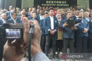 Anggota dewan profesor dan perwakilan civitas academica Universitas Brawijaya bersalaman usai pembacaan pernyataan sikap tentang penegakan hukum dan etika demokrasi di Indonesia, di depan gedung Rektorat Universitas Brawijaya, Malang, Jawa Timur, Selasa (6/2/2024). Dalam pernyataan tersebut mereka meminta pemerintah bersikap netral serta mewujudkan semangat reformasi pemerintahan yang bersih dari korupsi, kolusi, dan nepotisme sekaligus mendukung penegakan hukum yang adil terutama yang berkaitan dengan Pemilu 2024 sehingga kembali tercipta suasana politik yang damai dan beretika. ANTARA FOTO/Ari Bowo Sucipto/tom.