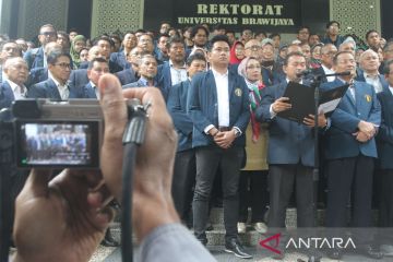 Anggota dewan profesor dan perwakilan civitas academica Universitas Brawijaya saat pembacaan pernyataan sikap tentang penegakan hukum dan etika demokrasi di Indonesia, di depan gedung Rektorat Universitas Brawijaya, Malang, Jawa Timur, Selasa (6/2/2024). Dalam pernyataan tersebut mereka meminta pemerintah bersikap netral serta mewujudkan semangat reformasi pemerintahan yang bersih dari korupsi, kolusi, dan nepotisme sekaligus mendukung penegakan hukum yang adil terutama yang berkaitan dengan Pemilu 2024 sehingga kembali tercipta suasana politik yang damai dan beretika. ANTARA FOTO/Ari Bowo Sucipto/tom.