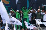 Para pendukung calon presiden-calon wakil presiden no urut 1 beratraksi saat kampanye akbar Partai Kebangkitan Bangsa (PKB) di Lapangan Lugjag, Banyuwangi, Jawa Timur, Selasa (6/2/2024). Kampanye tersebut selain untuk memenangkan Partai PKB juga untuk menjaring dukungan pasangan capres-cawapres nomor urut 1 Anis Rasyid Baswedan-Muhaimin Iskandar pada pemilu 14 Pebruari 2024. ANTARA FOTO/Budi Candra Setya/YU