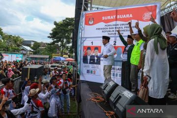 Calon wakil presiden no urut 1 Muhaimin Iskandar (tengah) mensimulasikan pencoblosan di hadapan pendukungnya pada kampanye akbar Partai Kebangkitan Bangsa (PKB) di Lapangan Lugjag, Banyuwangi, Jawa Timur, Selasa (6/2/2024). Kampanye tersebut selain untuk memenangkan Partai PKB juga untuk menjaring dukungan pasangan capres-cawapres nomor urut 1 Anis Rasyid Baswedan-Muhaimin Iskandar pada pemilu 14 Pebruari 2024. ANTARA FOTO/Budi Candra Setya/YU