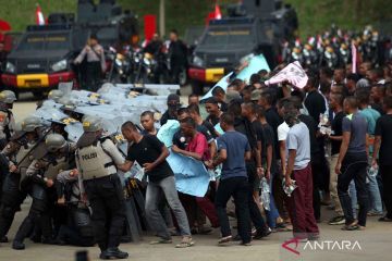 Personel Korps Brimob Polri mengamankan situasi saat simulasi pengamanan pemilu di di Pusat Latihan Brimob, Cikeas, Kabupaten Bogor, Jawa Barat, Rabu (7/2/2024). Simulasi tersebut untuk meningkatkan kemampuan personel pengamanan serta mengantisipasi potensi gangguan keamanan jelang penyelenggaraan Pemilu 2024. ANTARA FOTO/Yulius Satria Wijaya/nym.