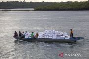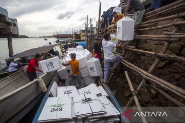 Pekerja memasukkan logistik Pemilu 2024 ke dalam perahu motor untuk didistribusikan ke Pulau Bulang di Batam, Kepulauan Riau, Rabu (7/2/2023). KPU Kota Batam menargetkan pendistribusian logistik Pemilihan Legislatif dan Pemilihan Presiden 2024 di daerah Tertinggal, Terdepan, Terluar (3T) yakni Pulau Bulang, Pulau Galang, Pulau Belakangpadang dan Pulau Ngenang selesai pada 8 Februari 2024 dengan menggunakan transportasi laut. ANTARA FOTO/Teguh Prihatna/rwa.