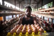 Pekerja menunjukkan telur-telur ayam usai dipanen di salah satu peternakan yang dikelola Keuskupan Agats di Distrik Agats, Kabupaten Asmat, Papua Selatan, Minggu (11/2/2024). Keuskupan Agats mengelola peternakan ayam petelur selain untuk dipasarkan kepada masyarakat sekitar juga untuk pemenuhan gizi masyarakat Asmat. ANTARA FOTO/Aprillio Akbar/aww.
