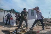 Petugas pemungutan Kecamatan (PPK) mengangkat logistik Pemilu menggunakan perahu pincara ke Desa Muara Sampara, Konawe, Sulawesi Tenggara, Senin (12/2/2024). Perahu pincara menjadi satu-satunya sarana pendistribusian logistik pemilu ke wilayah yang memiliki DPT sebanyak 358 orang tersebut. ANTARA FOTO/Andry Denisah/YU
