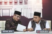 Ketua KPU Hasyim Asy'ari (kiri) berbincang dengan anggota KPU Mochammad Afifuddin di sela penyampaian keterangan pers di kantor KPU, Jakarta, Senin (12/2/2024). Konferensi pers tersebut membahas persiapan Indonesia Election Visit Program (IEVP) pada Pemilu 2024. ANTARA FOTO/Hafidz Mubarak A/YU