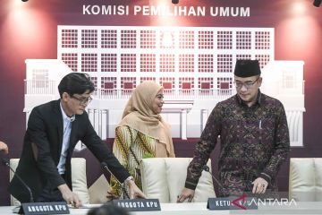 Ketua KPU Hasyim Asy'ari (kanan) bersama anggota KPU Betty Epsilon Idroos (tengah) dan August Mellaz (kiri) bersiap memberikan keterangan pers di kantor KPU, Jakarta, Senin (12/2/2024). Konferensi pers tersebut membahas persiapan Indonesia Election Visit Program (IEVP) pada Pemilu 2024. ANTARA FOTO/Hafidz Mubarak A/YU