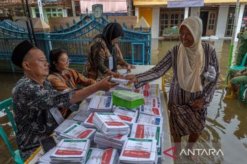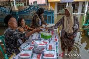 Petugas Kelompok Penyelenggara Pemungutan Suara (KPPS) melayani warga yang akan menggunakan hak pilihnya di Tempat Pemungutan Suara (TPS) 02 yang terkepung banjir di Desa Ngelowetan , Kecamatan Mijen, Kabupaten Demak, Jawa Tengah, Rabu (14/2/2024). Sejumlah TPS di Kecamatan Mijen terpaksa dipindahkan ke area yang lebih aman dari genangan banjir pada hari Pemilu 2024 karena adanya banjir di luar prediksi pada Selasa (13/2) dini hari limpasan aliran banjir Kecamatan Karanganyar, Kabupaten Demak. ANTARA FOTO/Aji Styawan/pras.