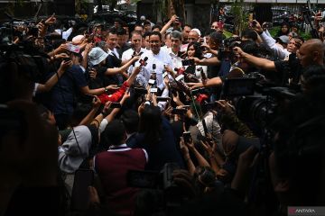 Calon presiden nomor urut 1 Anies Baswedan (tengah) menyampaikan keterangan kepada wartawan di posko pemenangan di Jalan Diponegoro, Menteng, Jakarta, Rabu (14/2/2024). Anies menanggapi santai dan tidak terburu-buru dalam menyimpulkan hasil Pemilu 2024 dari hasil hitung cepat Pilpres 2024 sejumlah lembaga survey dan menghormati hasil hitung nyata dari KPU. ANTARA FOTO/Aditya Pradana Putra/foc.