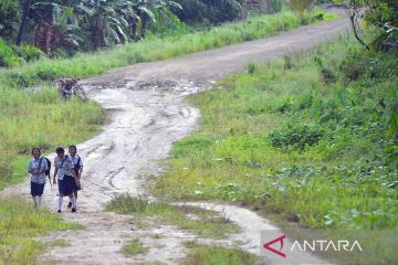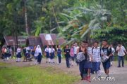 Sejumlah pelajar SMP berjalan kaki sepulang sekolah di Dusun Ugai, Desa Madobag, Siberut Selatan, Kabupaten Kepulauan Mentawai, Sumatera Barat, Kamis (15/2/2024). Pelajar di daerah tersebut harus berjalan kaki hingga dua jam untuk pergi atau pulang dari sekolah mereka karena ketiadaan transportasi umum. ANTARA FOTO/Iggoy el Fitra/Spt.
