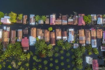Foto udara banjir menggenangi kawasan permukiman di Desa Sungai Bungur, Muaro Jambi, Jambi, Selasa (20/2/2024). Banjir yang menggenangi ratusan rumah akibat meluapnya Sungai Batanghari yang telah berlangsung lebih dari delapan minggu tersebut menghambat aktivitas warga serta peniadaan kegiatan sekolah secara tatap muka tersebut. ANTARA FOTO/Wahdi Septiawan/foc.