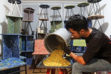Seorang perajin memperlihatkan limbah plastik untuk dijadikan kerajinan tangan di Padang, Sumatera Barat, Senin (26/2/2024). Pemanfaatan sampah plastik daur ulang yang dijadikan produk mebel, jam dinding dan suvenir tersebut di jual dengan harga Rp12 ribu hingga Rp500 ribu per satuannya. ANTARA FOTO/Muhammad Arif Pribadi/foc.