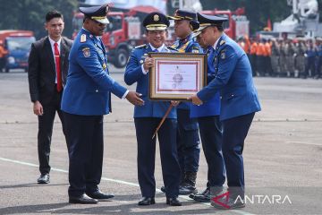 Menteri Dalam Negeri Tito Karnavian (tengah) memberikan piagam penghargaan kepada Wali Kota Surabaya Eri Cahyadi (kanan) saat upacara puncak Hari Ulang Tahun (HUT) ke-105 Pemadam Kebakaran dan Penyelamatan di Lapangan Kodam V Brawijaya, Surabaya, Jawa Timur, Jumat (1/3/2024). Puncak HUT ke-105 tersebut diikuti perwakilan personel pemadam kebakaran dan penyelamatan se-Indonesia dengan tema 'Pemadam Kebakaran dan Penyelamatan Profesional, Rakyat Terlindungi'. ANTARA FOTO/Rizal Hanafi/Spt.