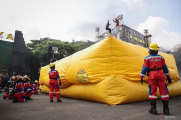 Sejumlah personel pemadam kebakaran dan penyelamatan melakukan simulasi penanganan korban kebakaran saat upacara puncak Hari Ulang Tahun (HUT) ke-105 Pemadam Kebakaran dan Penyelamatan di Lapangan Kodam V Brawijaya, Surabaya, Jawa Timur, Jumat (1/3/2024). Puncak HUT ke-105 tersebut diikuti perwakilan personel pemadam kebakaran dan penyelamatan se-Indonesia dengan tema 'Pemadam Kebakaran dan Penyelamatan Profesional, Rakyat Terlindungi'. ANTARA FOTO/Rizal Hanafi/Spt.