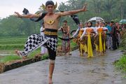 Seniman mengikuti kirab menuju sendang Dawung saat tradisi Bajong Banyu di Dusun Dawung, Banjarnegoro, Mertoyudan, Magelang, Jawa Tengah, Minggu (3/3/2024). Tradisi Bajong Banyu dilakukan warga setempat sebagai sukacita menyambut datangnya bulan suci Ramadhan sekaligus sebagai wujud pelestarian lingkungan. ANTARA FOTO/Anis Efizudin/foc.