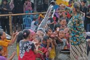 Warga menyiram air saat tradisi Bajong Banyu di Dusun Dawung, Banjarnegoro, Mertoyudan, Magelang, Jawa Tengah, Minggu (3/3/2024). Tradisi Bajong Banyu dilakukan warga setempat sebagai sukacita menyambut datangnya bulan suci Ramadhan sekaligus sebagai wujud pelestarian lingkungan. ANTARA FOTO/Anis Efizudin/foc.