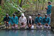 Sejumlah tokoh masyarakat mengambil air di sendang Dawung saat tradisi Bajong Banyu di Dusun Dawung, Banjarnegoro, Mertoyudan, Magelang, Jawa Tengah, Minggu (3/3/2024). Tradisi Bajong Banyu dilakukan warga setempat sebagai sukacita menyambut datangnya bulan suci Ramadhan sekaligus sebagai wujud pelestarian lingkungan. ANTARA FOTO/Anis Efizudin/foc.