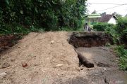 Kondisi jalan penghubung antardusun rusak terdampak bencana tanah bergerak di Dusun Sumberlamong, Desa Sambirejo, Kecamatan Wonosalam, Kabupaten Jombang, Jawa Timur, Kamis (7/3/2024). Pergerakan tanah yang terjadi pada Rabu (6/3/2024) tengah malam saat hujan deras itu mengakibatkan 12 rumah dan fasilitas umum rusak, akses jalan terputus dan puluhan warga terdampak mengungsi ke tempat yang aman. ANTARA FOTO/Syaiful Arif/foc.